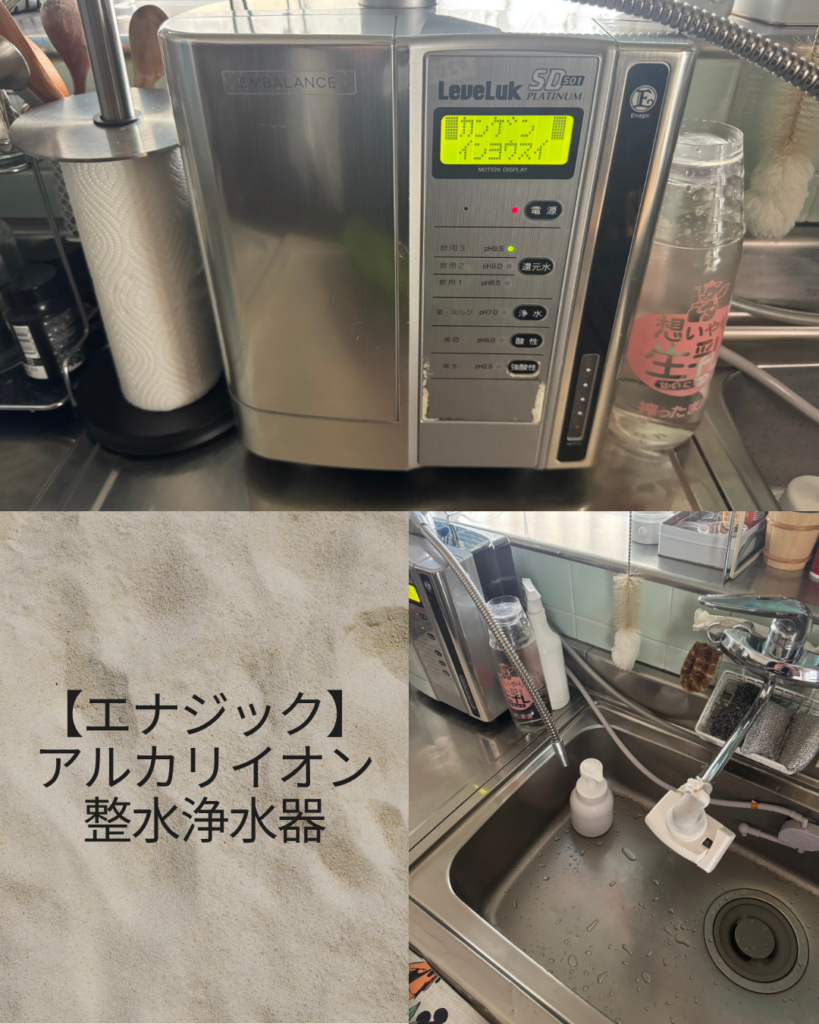 どちらも飲み水として利用できますが、エナジックは水道の蛇口につけるタイプで主にアルカリ性でキレイな水を日常的に飲むために使っています。