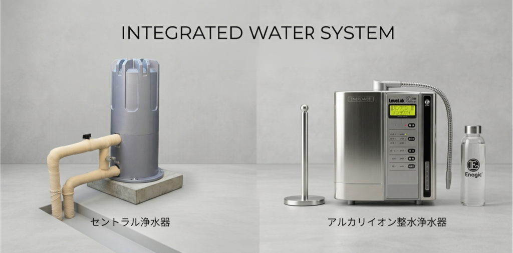 エナジックのアルカリイオン整水浄水器は僕が販売店登録しているもので、アクアテラホームはPRをやらせていただいております。どちらも自費で正規の価格で購入しています。水を毎月たくさん買って飲んでいましたが、ゴミが出るのでエコではないし、かなりのお金を使っていました。数々の浄水器などを調べて、探し求めた結果、初期投資は高いものの